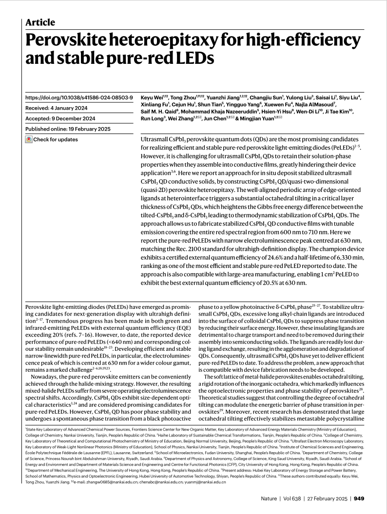 该研究针对新型钙钛矿超高清显示技术中纯红光CsPbI3钙钛矿量子点材料相稳定性差这一世界难题,率先提出“外延异质结界面应力操控”策略,首次利用全溶液法实现钙钛矿范德华外延异质结的大面积原位可控制备,并结合先进的低剂量球差透射电子显微镜技术,成功揭示钙钛矿外延异质结构的界面应力对量子点晶格结构的调控机制,突破材料稳定性与器件性能双重瓶颈,研发出高效率与高稳定性兼备的纯红光钙钛矿电致发光器件(LED),为下一代超高清显示技术发展提供了关键技术支撑。周峒博士为本文共同第一作者。中国科学院陈军院士、南开大学化学学院袁明鉴教授、章炜研究员为该论文通讯作者。南开大学化学学院为本文通讯单位,国产精品永久久久久久久久久|91精品无码国产在线观看一区|久久人爽爽人爽爽ąV无码自慰|最新无码国模国产在线|2020最新无码国产在线观看储能与动力电池湖北省重点实验室为本文合作单位之一。