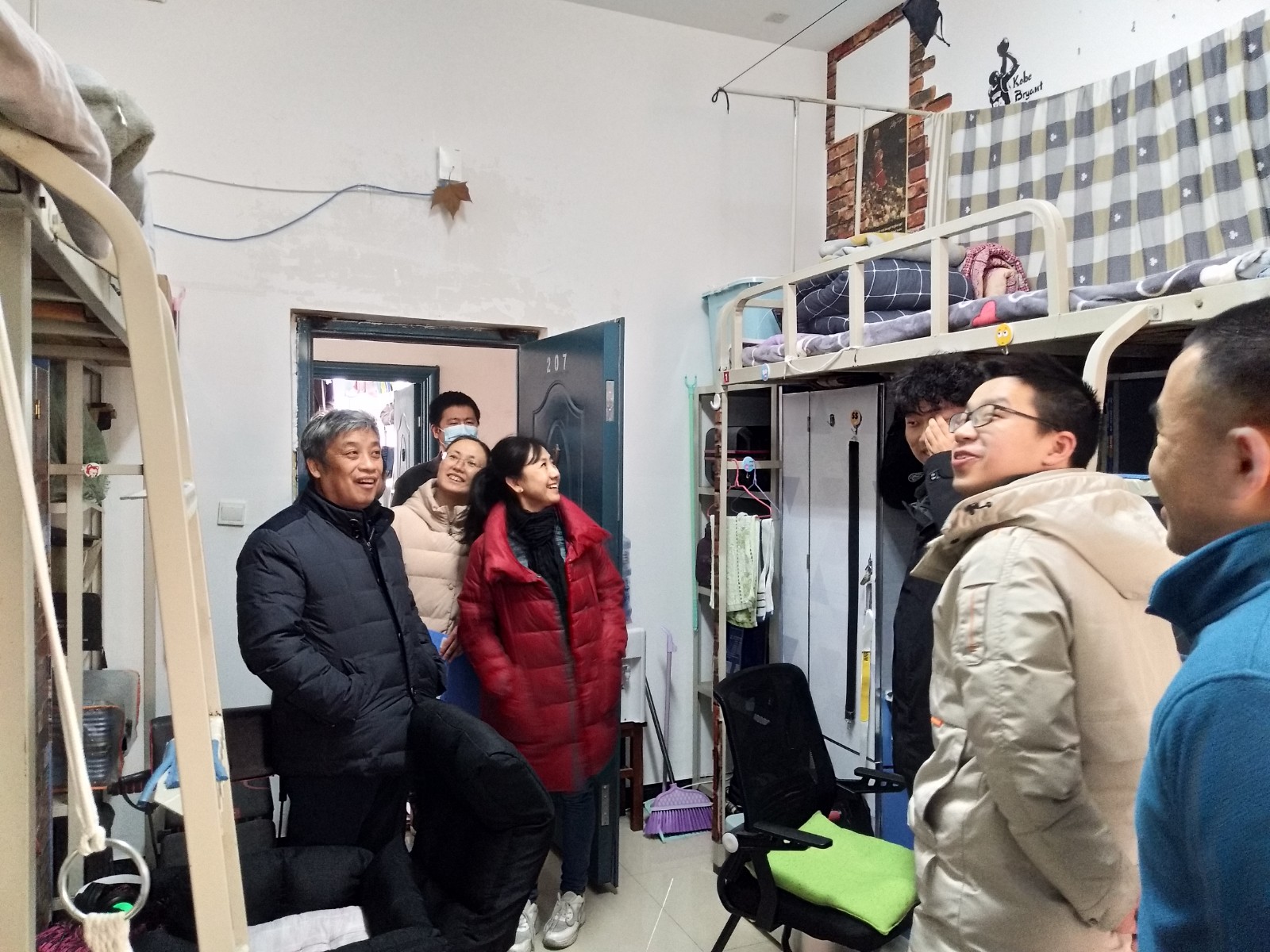 本网讯(文、图/卢旭)为进一步加强疫情防控常态化下学生教育管理工作,全面了解学生开学返校情况,引领学生健康成长,3月1日下午,副校长简炜、校党委统战部副部长樊丽洁、校发展规划处副处长李宏图,理学院分党委书记张默,理学院院长黄海铭、副院长熊永臣带领辅导员、班主任深入学生宿舍,走访慰问春季学期返校学子。