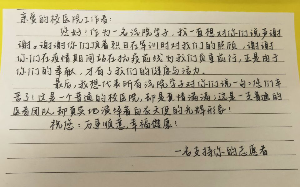 每年的新生军训,校医院都会派出医护到现场值班,以防学生发生意外时能第一时间赶到。没有想到的是,看似再平常不过的工作却被学生们看在眼里,记在心上。到今天以这样的形式传递着他们的感谢之情。小小的一封感谢信即传达了学生对校医院工作人员的感激之情也印证了那句话:真情服务暖人心,医者仁心有大爱。