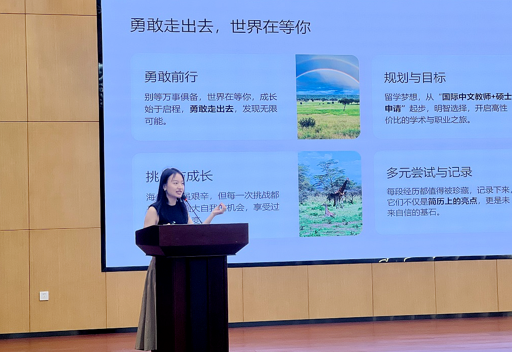作为我校孔子学院首批汉语教师志愿者,两人在加纳工作一年间,成为中加文化互动的“活名片”。分享会上,她们以亲历者视角讲述工作日常:蔡柳依在汉语课中融入八极拳、书法、国画等传统文化体验,当加纳学生用毛笔写“你好”、剪纸“福”字时,眼中的惊喜让她感受到文化交流的力量;付雅巍则结合当地学生兴趣设计教学,如用流行音乐歌词讲解中文语法,激发学习热情。在她们的努力下,所带班级在YCT考试中成绩优异,学生斩获“汉语桥”加纳赛区冠军。