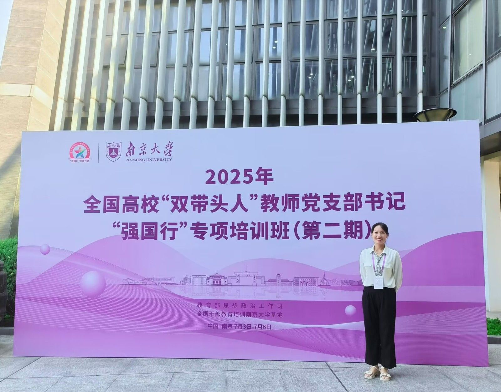 本网讯(文/覃群)7月3日至6日,2025年全国高校“双带头人”教师党支部书记“强国行”专项培训班(第二期)在南京大学举办。汽车材料学院材料系党支部书记覃群(湖北省高校“双带头人”工作室负责人、全国“强国行”专项行动团队负责人)受邀参加了本次专题培训班。