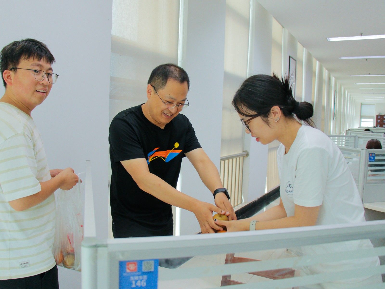 采摘结束后,在杜祥军和任慧玲的带领下,同学们将亲手采摘的果实送给图书馆留校备考的学生们。“这些梨子是同学们亲手采摘的,从‘枝头’直达‘心头’,饱含着收获的甘甜和对你们的深切祝福。希望这袋梨能为大家送去一丝清凉和甜蜜,缓解学习的疲惫。” 杜祥军在慰问时说道,并叮嘱学生们劳逸结合,注意防暑。